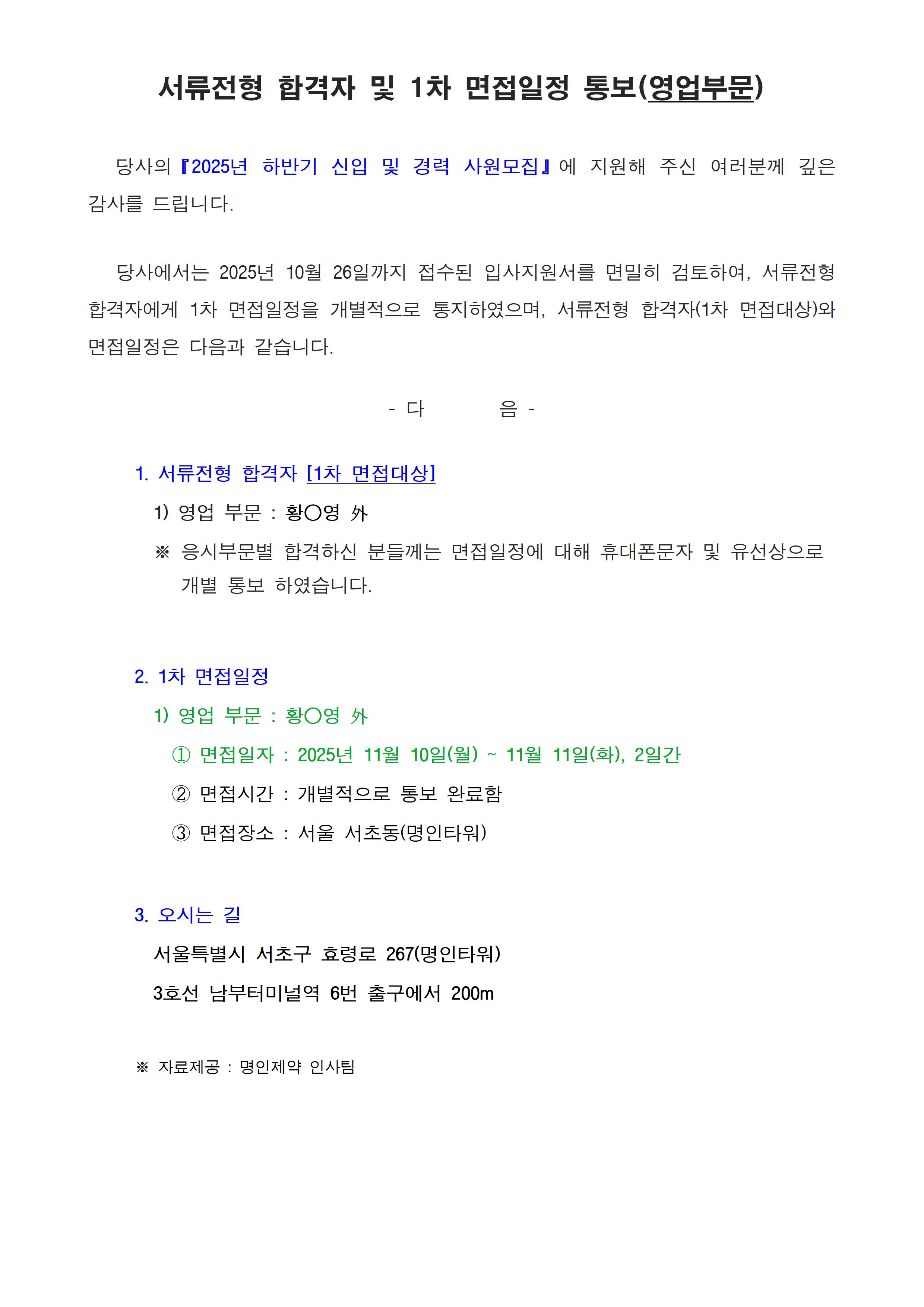 2025년 하반기 신입 및 경력 사원모집 서류전형 합격자 및 1차 면접일정(영업부문)