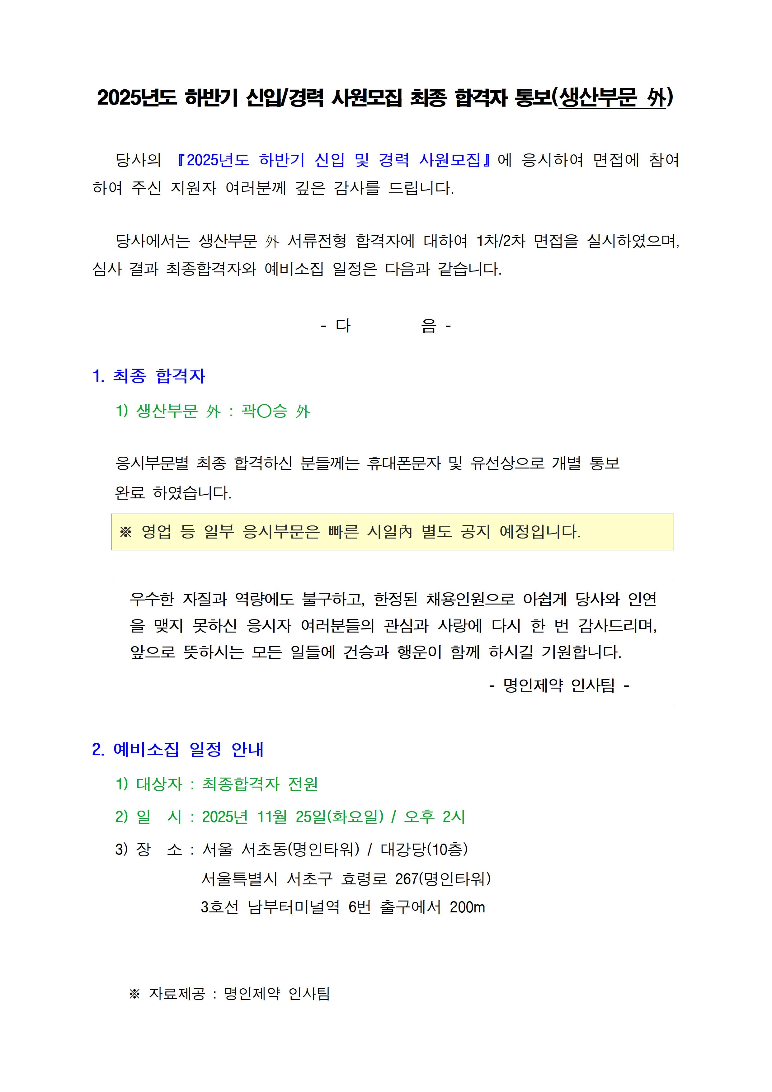 2025년 하반기 신입 및 경력 사원모집 최종합격 및 예비소집일정(생산부문外)