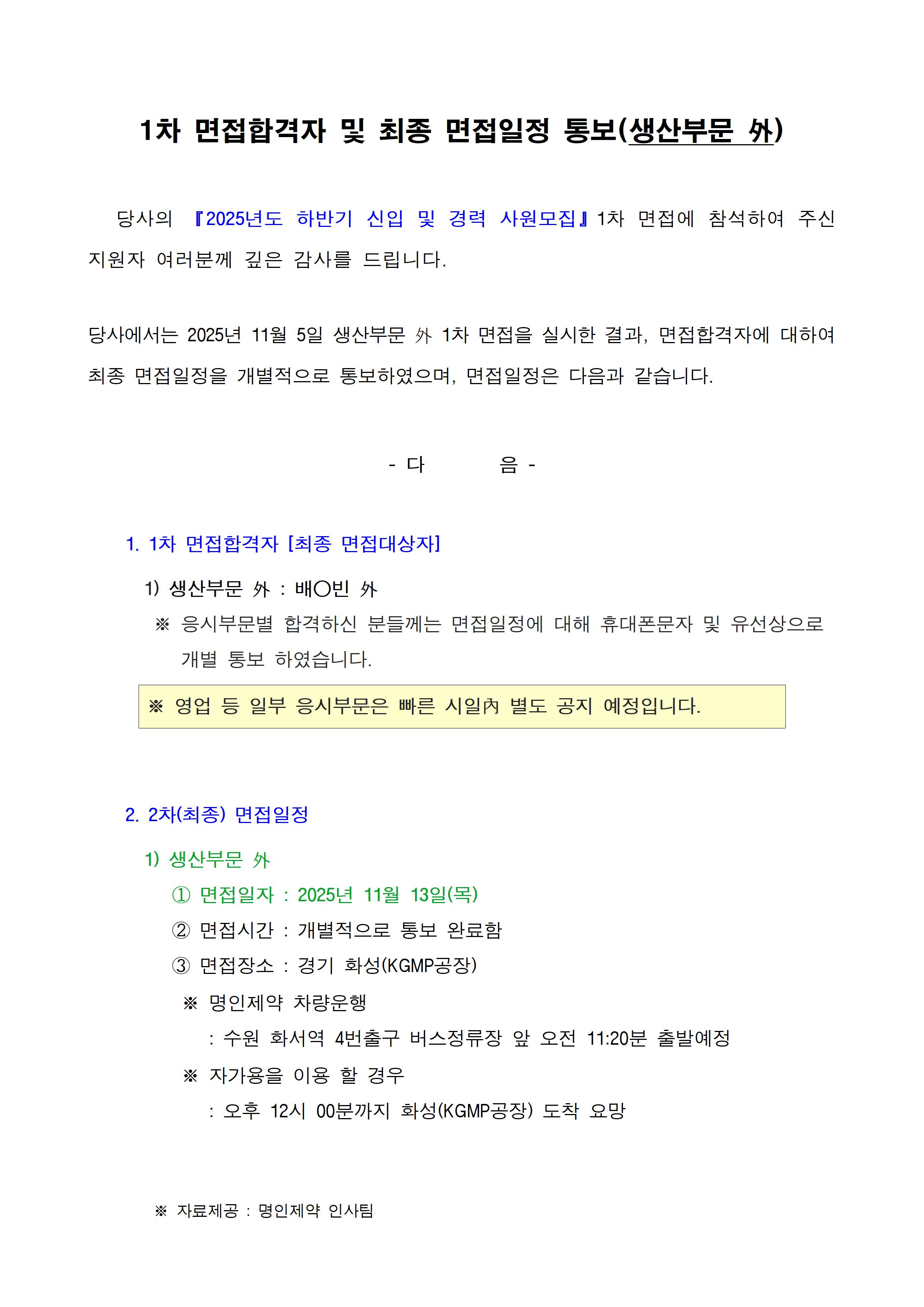 2025년 하반기 신입 및 경력 사원모집 1차면접 합격자 및 최종 면접일정(생산부문外)