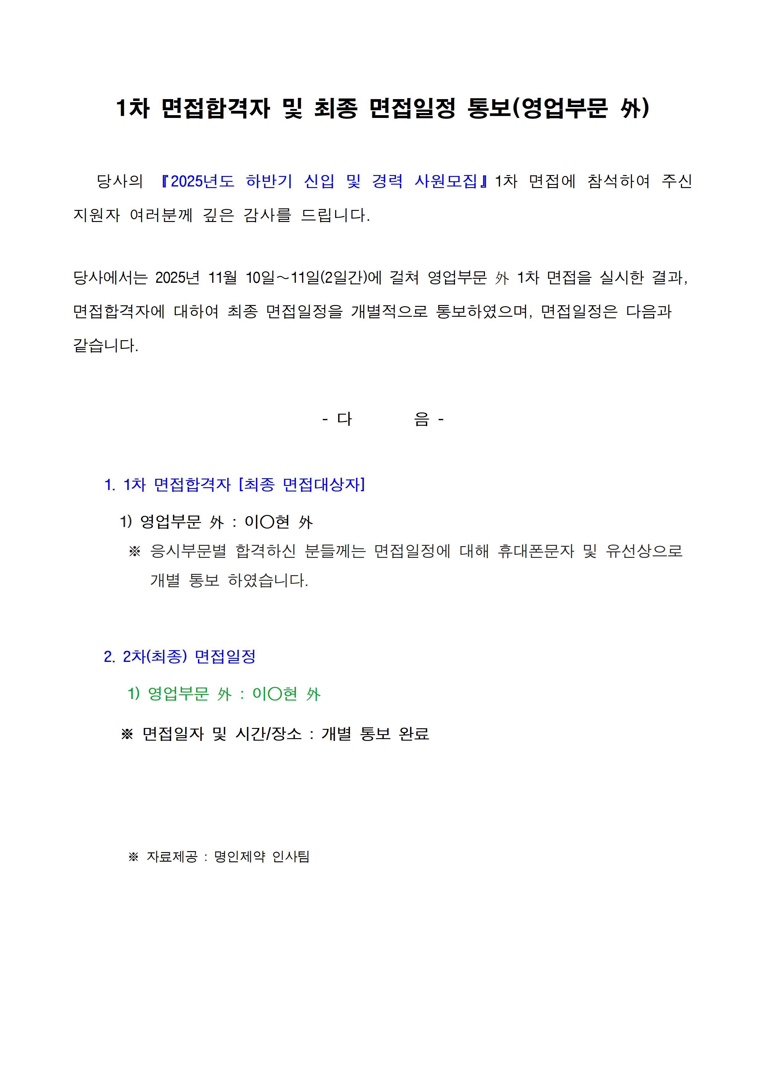 2025년 하반기 신입 및 경력 사원모집 1차면접 합격자 및 최종 면접일정(영업부문外)